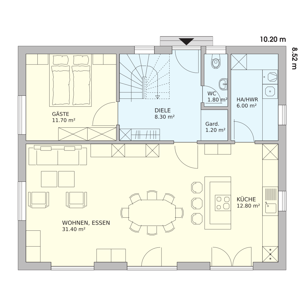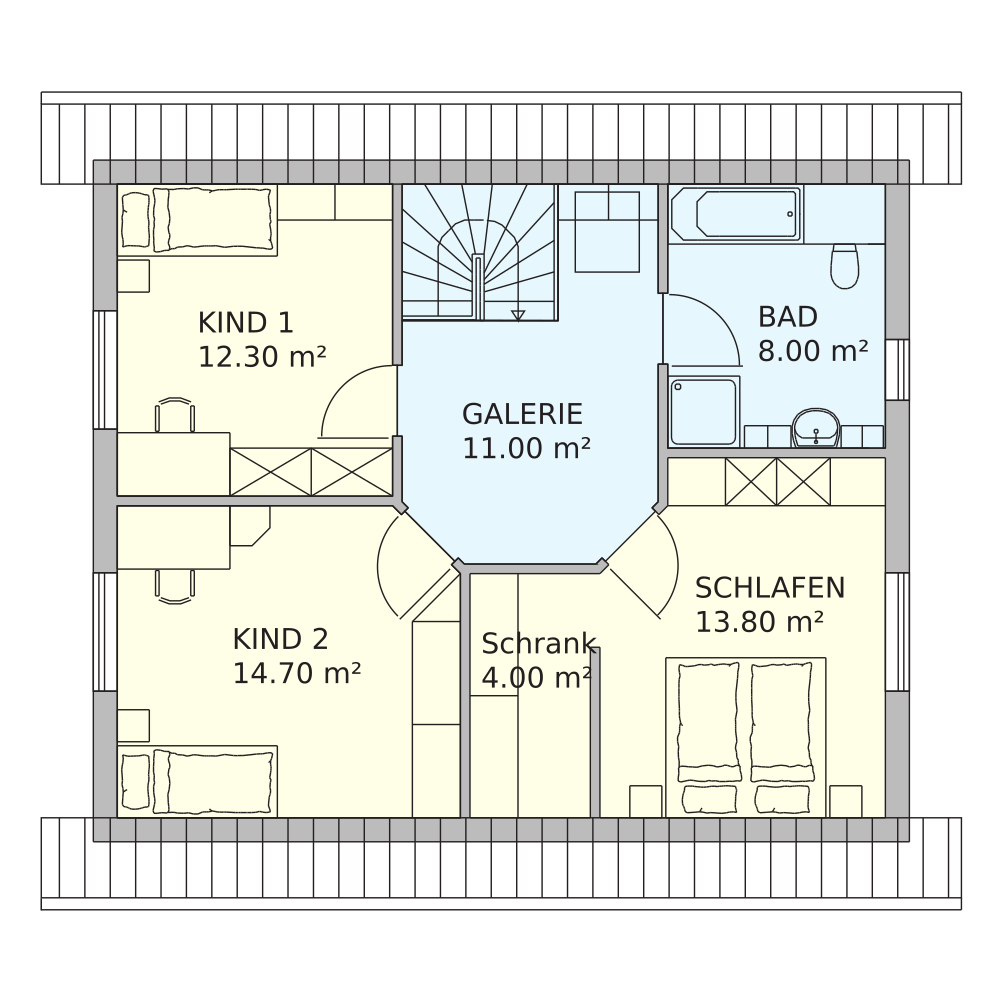 Die Fotos und Grundrisse verstehen sich als Vorschlag. Sonderausstattungen gehören nicht zum Basisangebot. Ihr Haus wird individuell nach Ihren Wünschen geplant und gebaut. Weitere Hausvorschläge finden Sie in unserem aktuellen Katalog »