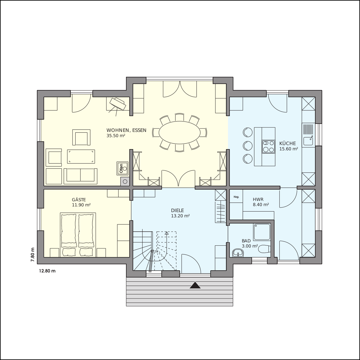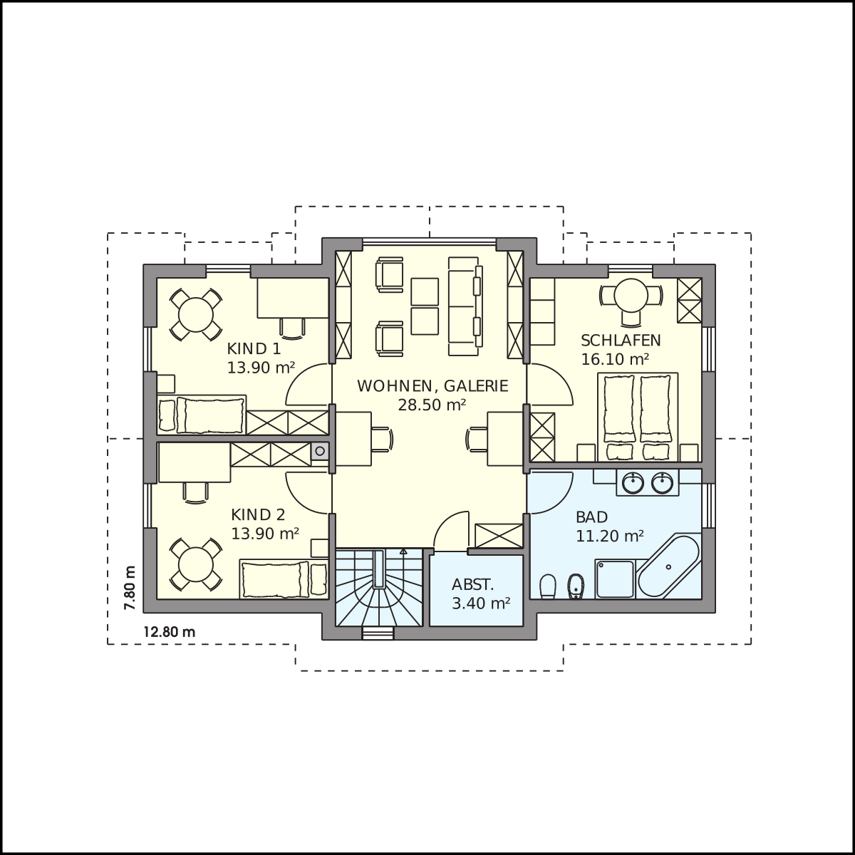 [/pane] [pane title=“Flächen“]Bebaute Fläche: Erdgeschoss 105,50 m² / Dachgeschoss 105,50 m²Wohn- und Nutzfläche: Erdgeschoss 87,60 m² / Dachgeschoss 87,00 m²Wohn- und Nutzfläche gesamt: 175 m²[/pane] [/accordion] Dieses Haus finden Sie in unserem Katalog auf Seite 77Die Fotos und Grundrisse verstehen sich als Vorschlag. Sonderausstattungen gehören nicht zum Basisangebot. Ihr Haus wird individuell nach Ihren Wünschen geplant und gebaut. Weitere Hausvorschläge finden Sie in unserem aktuellen Katalog »