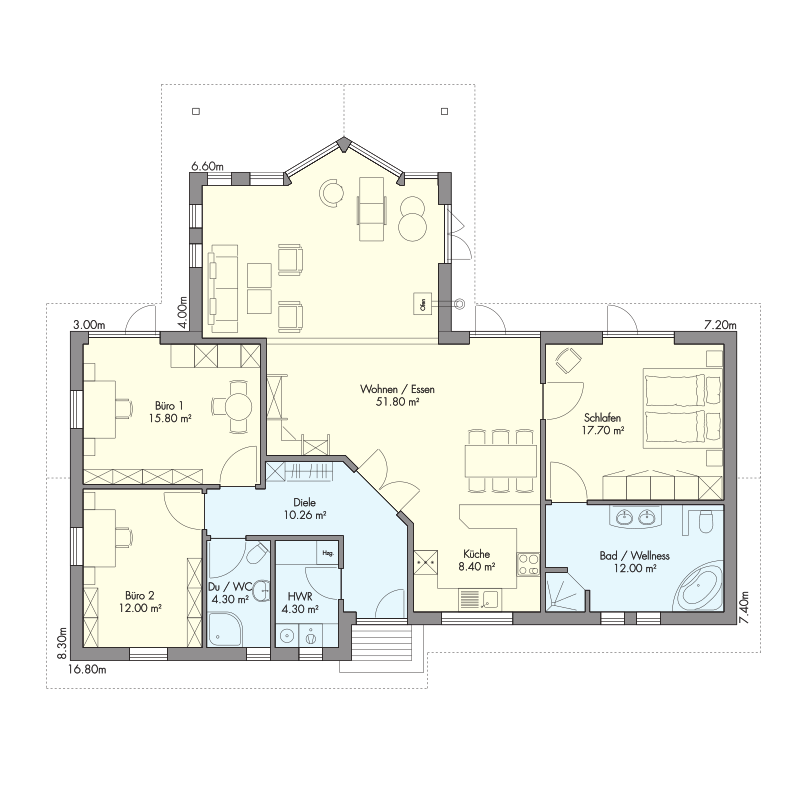 Die offene Raumgestaltung ermöglicht fließende Übergänge und gibt Ihnen die Flexibilität, die moderne Lebenskonzepte erfordern.